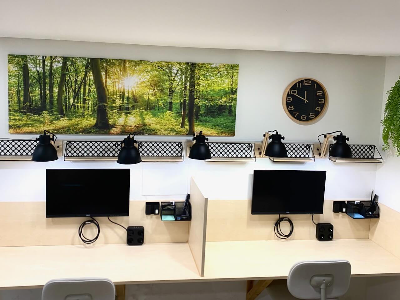 En el Pack Básico tienes tu propio espacio pequeño con un monitor de 24” ya montado, ideal para trabajar con un portátil.